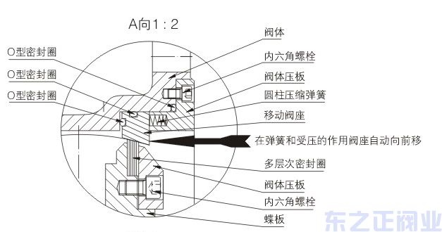 4、  自動補(bǔ)償雙向壓:(請見圖三)按圖從左往右施壓時,利用三偏心的原理,蝶板與閥體越關(guān)越緊,從而得到良好的密封;按圖從右往左施壓時,移動閥座在受壓力的推力和彈簧推力時,移動閥座自動向蝶板推緊,當(dāng)壓力越高移動閥座向蝶板越推越緊,從而得到良好的密封;因此本閥屬于雙向金屬硬密封蝶閥蝶,雙向壓也能達(dá)到100%的零泄漏;在長期的使用下,移動閥座密封和蝶板密封如有磨損或損傷,在彈簧作用下移動閥座自動向蝶板推進(jìn),在反向受壓時蝶板會向箭頭移動,這時則移動閥座在彈簧和壓力的作用它也會跟著前移,從而得到良好的自動補(bǔ)償功能。
